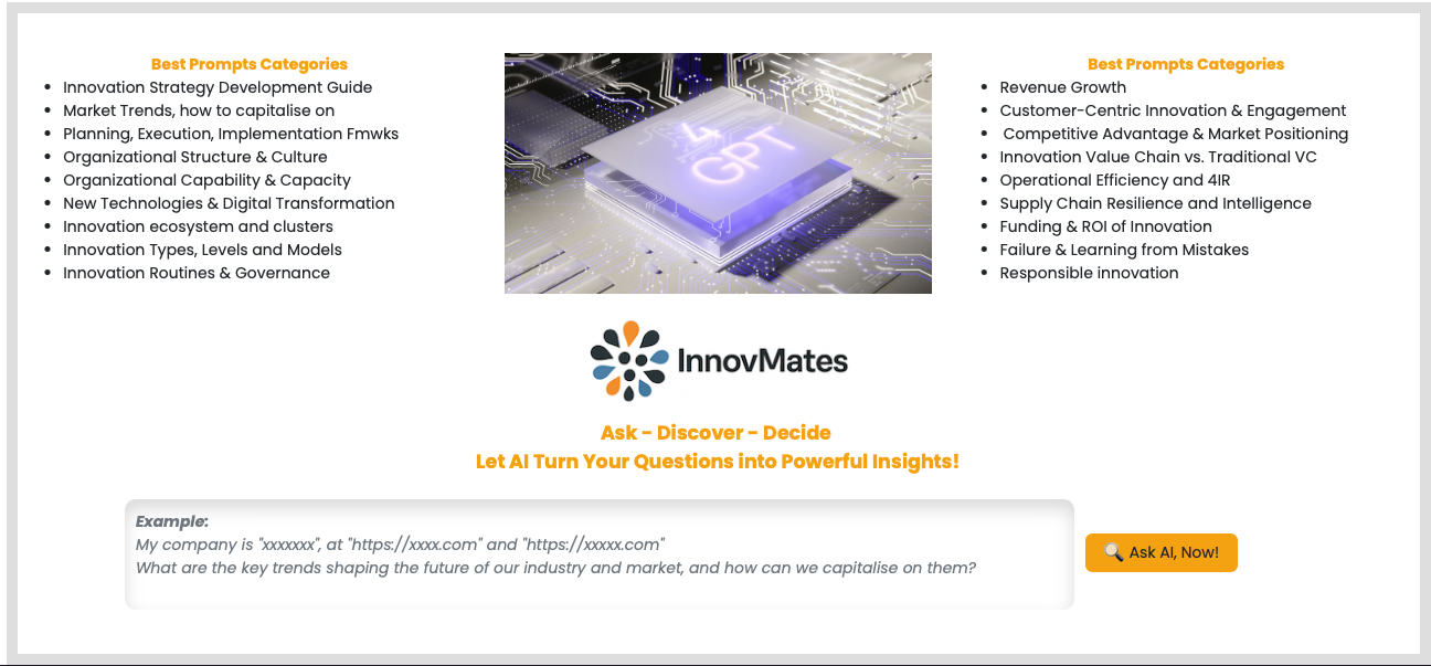 Strategise your Innovation Hall to Execute Faster and Smarter: Coupled with InnovMates’ powerful ERP-integrated AI platform, ChatGPT AI streamlines end-to-end innovation management processes from ideation through execution, monitoring, and scaling. Automate repetitive tasks, enhance customer experience, and unlock predictive capabilities, ensuring you deliver measurable results faster, cheaper, and at scale.